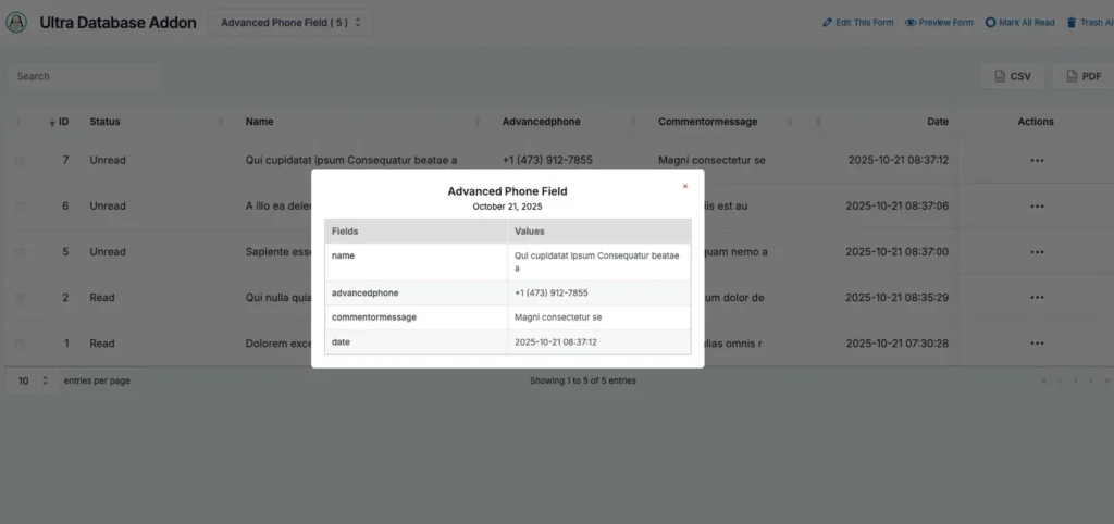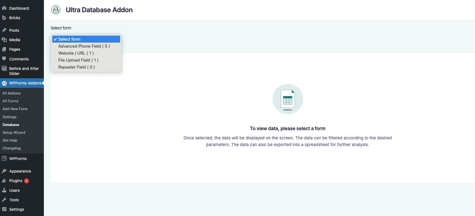 Discover how effortless it is to manage and customize your Database Addon For WPForms. Explore the intuitive backend interface — view entries, filter and search data, export submissions, and control all settings with ease. Click the image to enlarge and experience the full flexibility and power of your form management workflow.