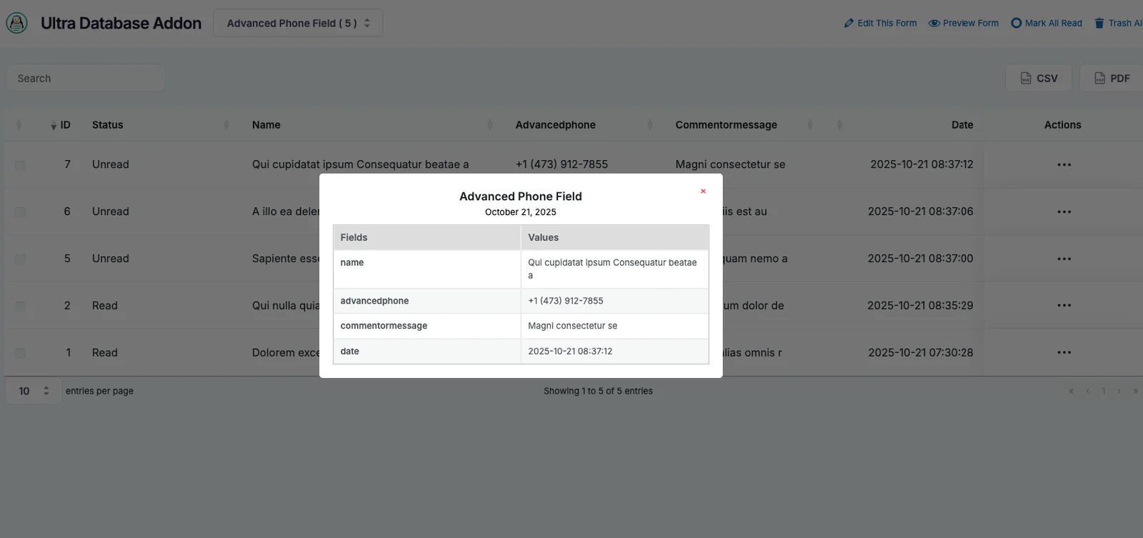 The Database addon helps store form data, view data in the admin backend, and export data in CSV format.