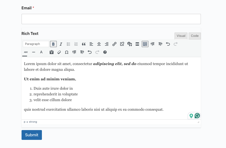 Enhance your forms with rich text formatting. The Rich Text Editor Addon gives users the ability to style their input, including bold text, links, lists, and more. This feature, once reserved for pro users, is now completely free to use!