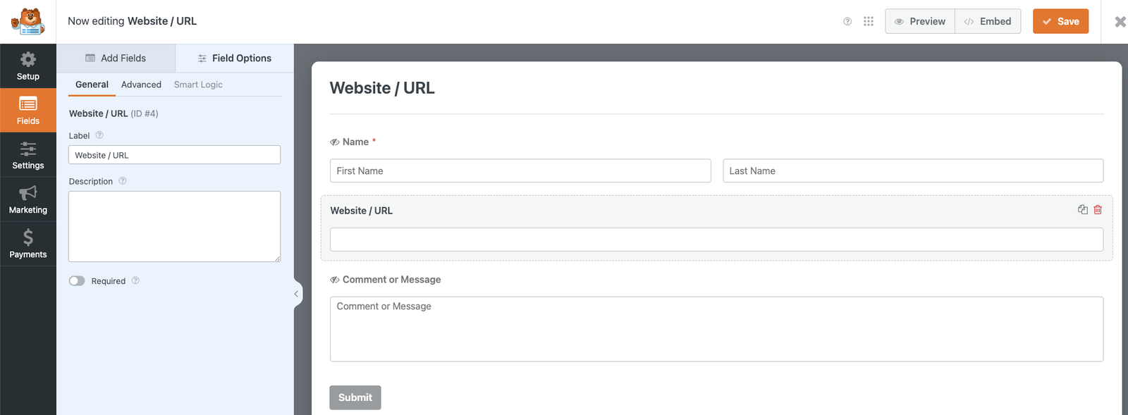 Add the Website/URL field to any WPForms form with a simple drag-and-drop. No coding is required — just place it where you need it.